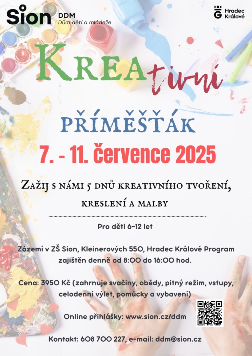 V termínu 7.-11. července 2025 pořádáme pro děti ve věku 6-12 let Kreativní příměšťák, kde děti mohou rozvíjet svou kreativitu a fantazii. Podrobnější informace naleznete pod přihláškou.
